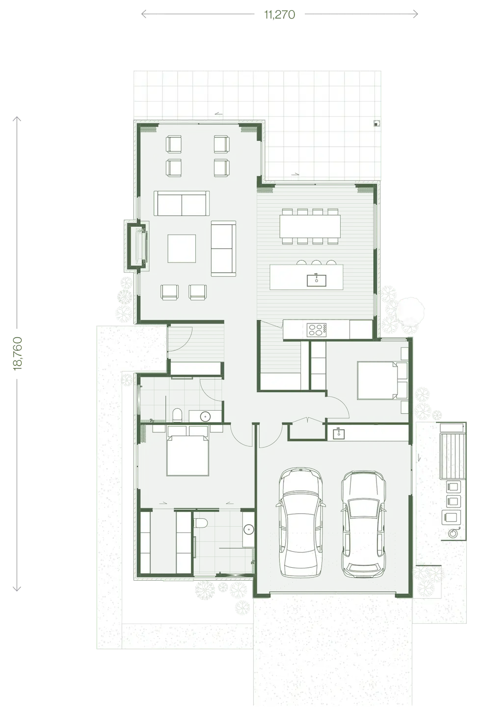 At 182m², our Motuihe villa is a popular two-bedroom design with all the modern finishes of a Sanderson Group home. Kitchen, dining and living spaces are connected through the L-shape layout for a seamless flow, with a double opening onto a covered outdoor dining area. Motuihe features a designer kitchen with scullery, two bedrooms, two bathrooms, a double car garage and a covered outdoor dining space.