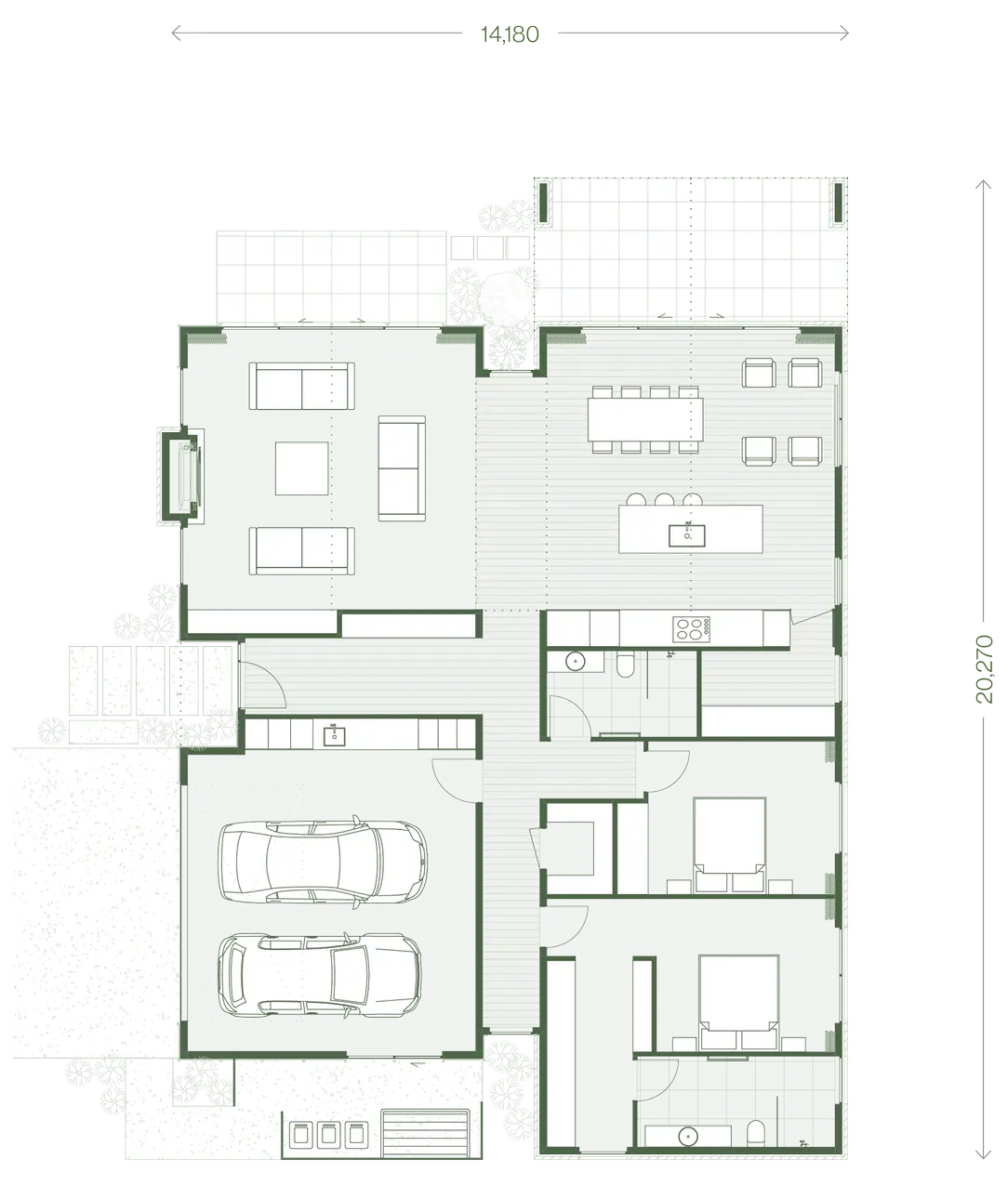 This design is inspired by one of the most popular villas from the Sanderson Group. Featuring a double-pavilion layout, it offers spacious open-plan living and dining, creating a luxurious sense of space. The home includes a walk-in pantry and two north-facing decks, perfect for indoor-outdoor living. The main bedroom boasts a generous walk-in wardrobe and a private ensuite. With a side-entry garage, the Rotoroa is a standout design that is hard to beat.